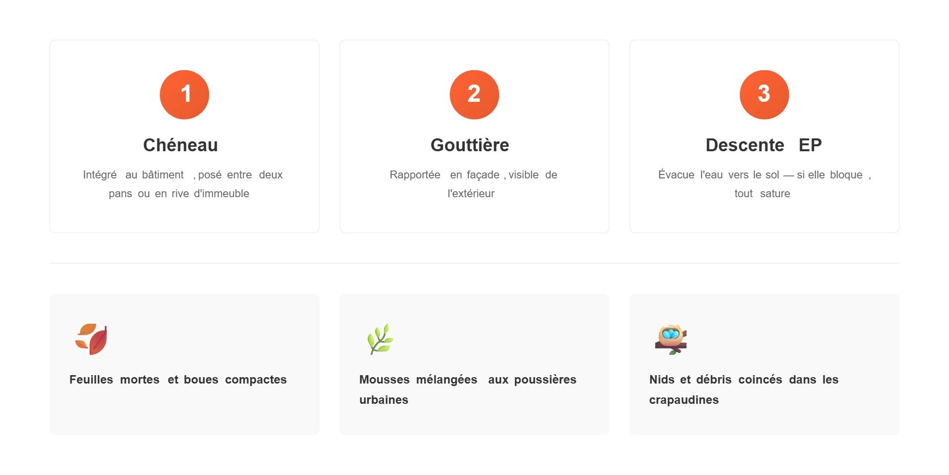 À Paris, on retrouve toujours les mêmes causes. Les feuilles mortes s'accumulent vite entre deux nettoyages. Les mousses se mélangent à la poussière urbaine et deviennent une pâte dense. Les nids d'oiseaux bouchent une crapaudine en une saison.