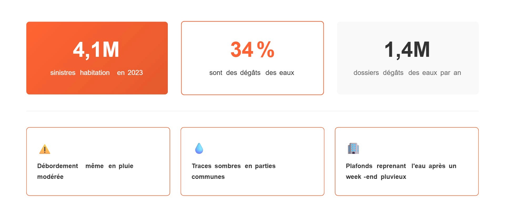 France Assureurs indique qu'en 2023, près de 4,1 millions de sinistres habitation ont été indemnisés. Les dégâts des eaux représentent 34 % de ces sinistres, soit environ 1,4 million de dossiers sur l'année.