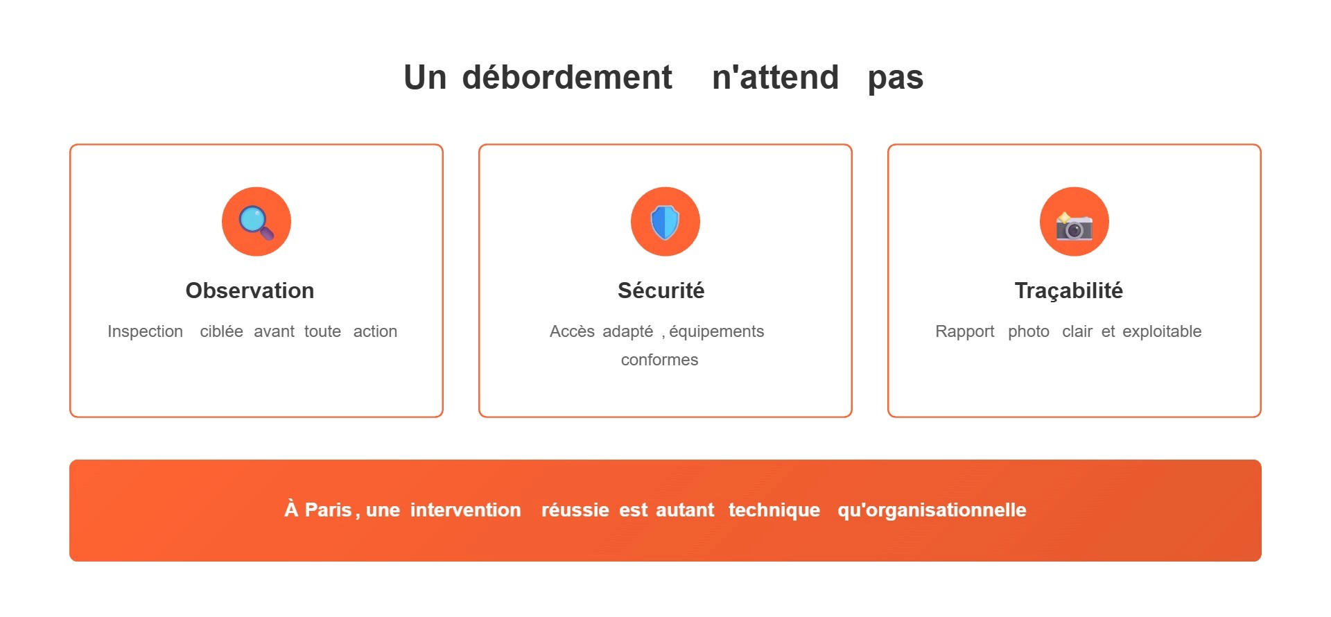 Notre approche privilégie l'observation, la sécurité et un rapport photo exploitable. Vous savez ce qui a été fait, et pourquoi. Si vous voulez un devis gratuit et une intervention sur Paris, contactez-nous. Transparence, sécurité, et traçabilité sont incluses, sans surprise.
