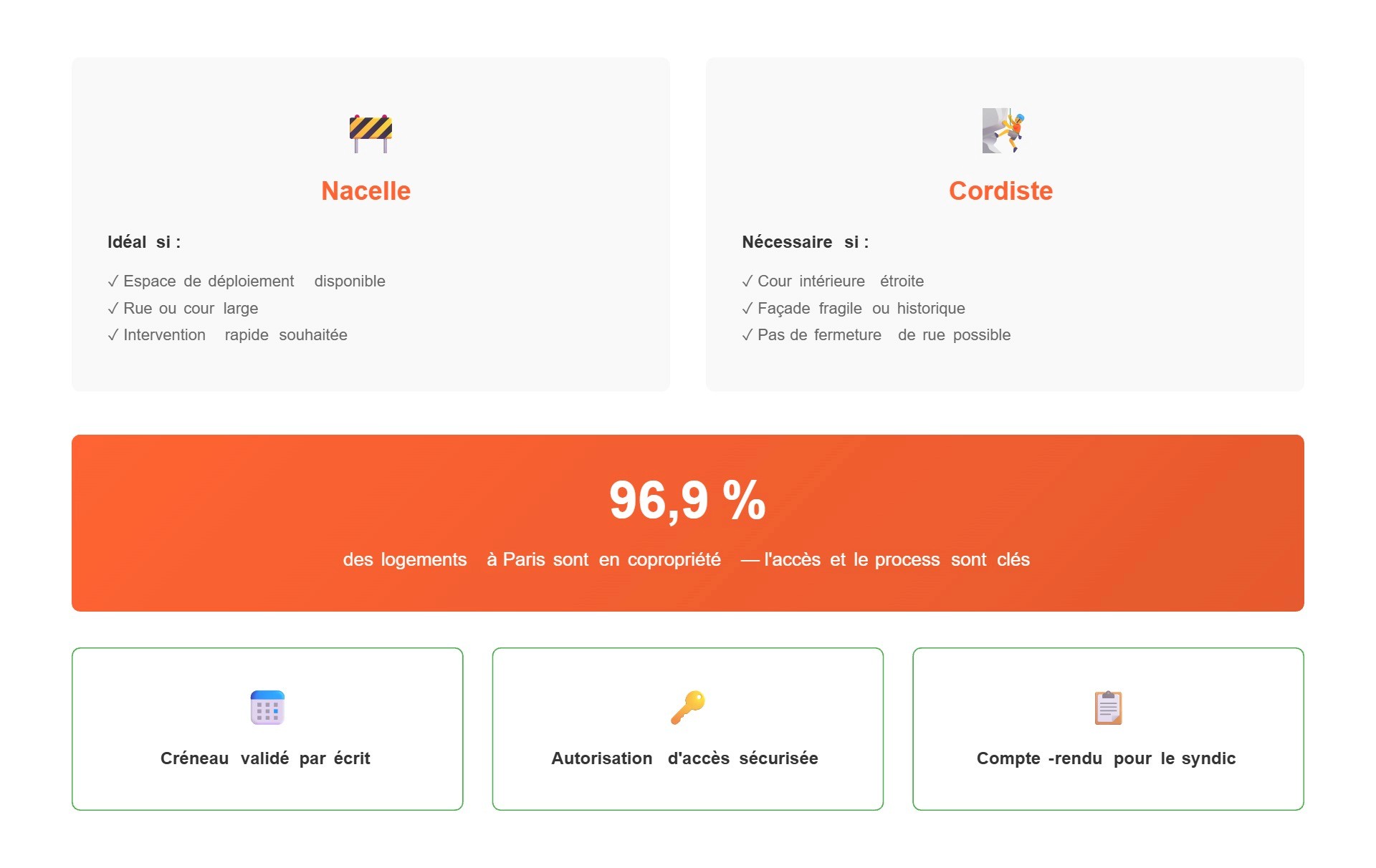 Imaginez deux options : la nacelle, c'est l'escalator quand il existe. Le cordiste, c'est l'escalier de secours quand l'immeuble ne laisse pas le choix. Sur Paris, la nacelle est idéale si on peut se poser et sécuriser la zone. Sinon, la corde devient plus logique, surtout en cour intérieure ou sur façades fragiles.