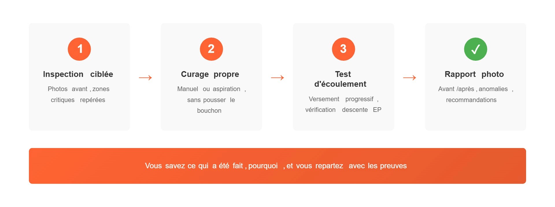 Ce que je conseille : demandez ce qui est inclus (sécurité, évacuation, test d'écoulement, compte-rendu) avant de comparer.